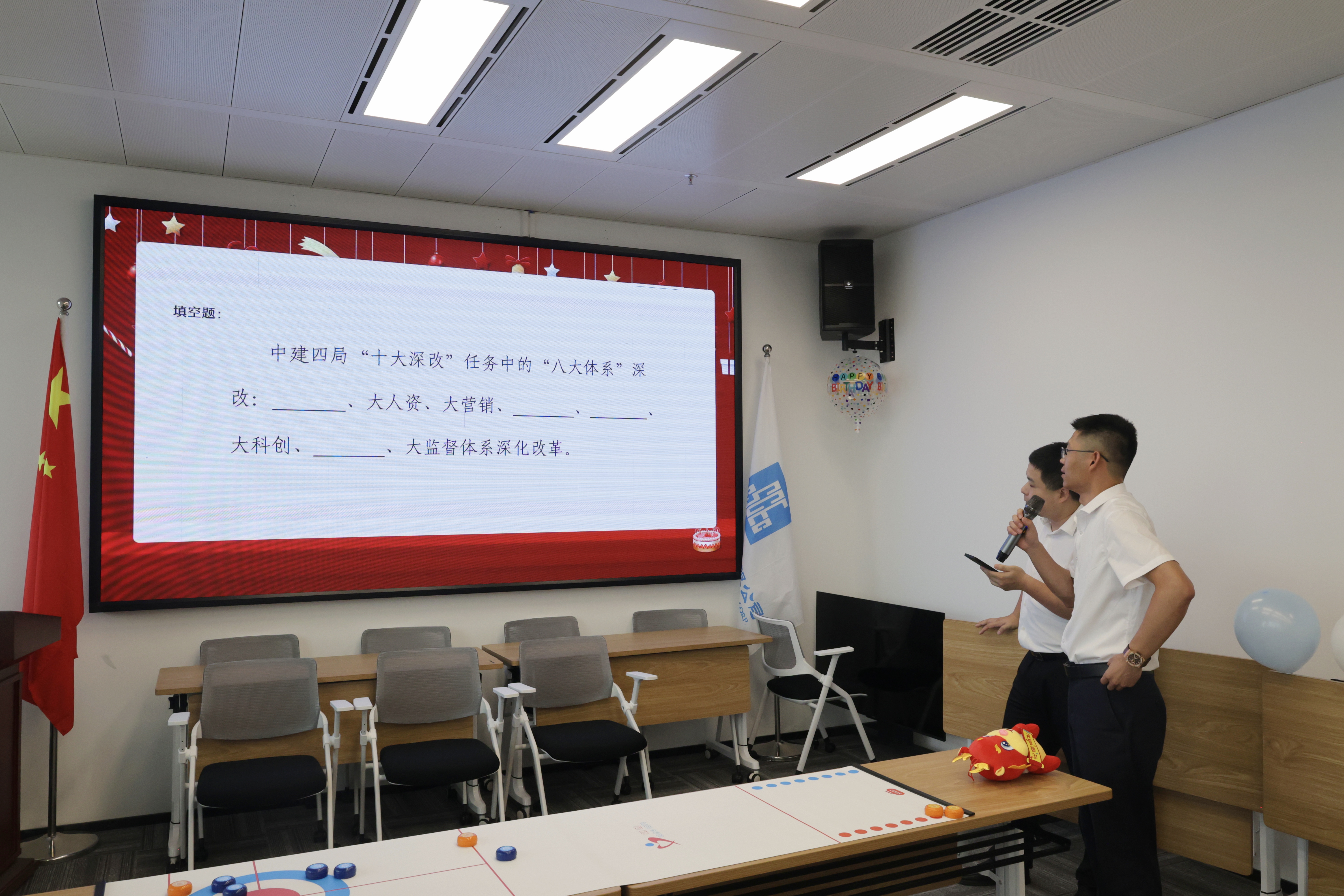 集体生日会在欢声笑语中拉开帷幕。首先由事业部工会主席致辞,向过生日的职工送上生日祝福,感谢包括这19位同志在内的职工们为事业部发展付出的辛勤努力。接着,进行了“桌上冰壶”“你画我猜”小游戏,生日会中还进行了问答环节,参加活动的职工们踊跃回答了关于党的基本知识、精诚文化、十大深改等内容的题目,赢取小礼品。现场气氛温馨而活跃,最后由“寿星”们共同吹灭生日蜡烛、一起许下新的愿望,职工们在轻松愉快的氛围中度过了一个难忘的生日。